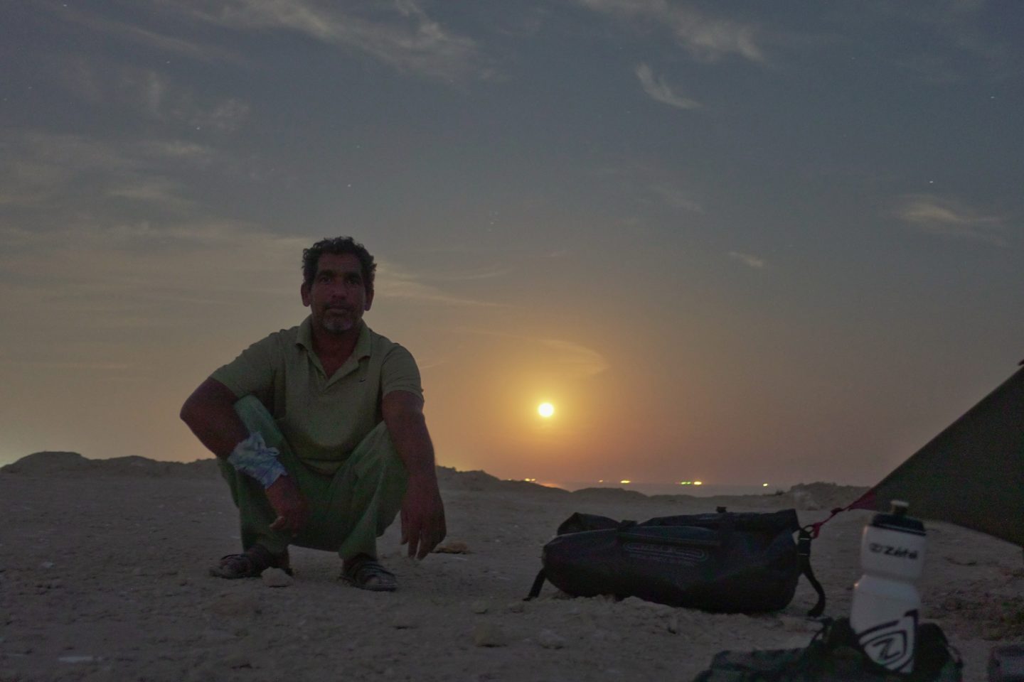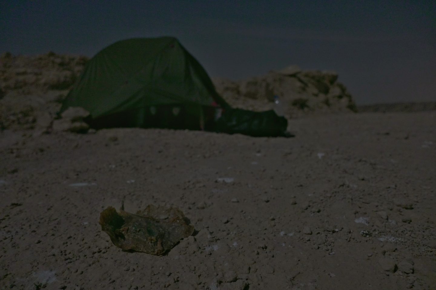 Some experiences standing out though. My first night I slept on a Mountaintop which was ragged off to a Plato to dry fish on it. Only people who smelled something like this before can imaging how it stunk. I arrived up there by instinct like always, after I was not allowed to camp in a Palmgarden, (Dangerous Snakes, told me the Landlord) anyway. I took the dirt road into the next Valley when i spotted a way uphill. Uphill promise usually a nice View, and I am a sucker for it! While reaching the top I noted some workers, visa verse, collecting the dried fish. I said Hello to the guys from Pakistan who spoke even less Farsi than I do but the Vibe was good. Took a place on the edge of the plato where no fish was and the view descent. I set up camp while the sun sunk down the horizon bloody red like the full moon on opposite site rise. The workers came over after work for a chat and we set in front my tent eating cookies, showing pics, listen to Pakistani music and smoking a pack of cigarettes, which I have always in my panniers for upcoming situations.