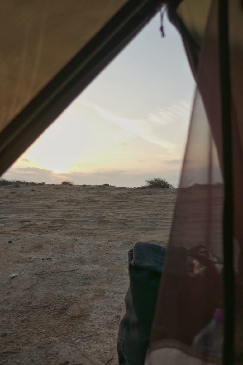 After some attempt of nothingness I followed a dirt road along the coast (always a good sign). Behind a dirt wall I shared the path with some Streetdogs which are on their way to use the low water for scanning the beach for food. Found a single tree to put my tent underneath during the sinking sun, when a man approached me from the distance coming by.